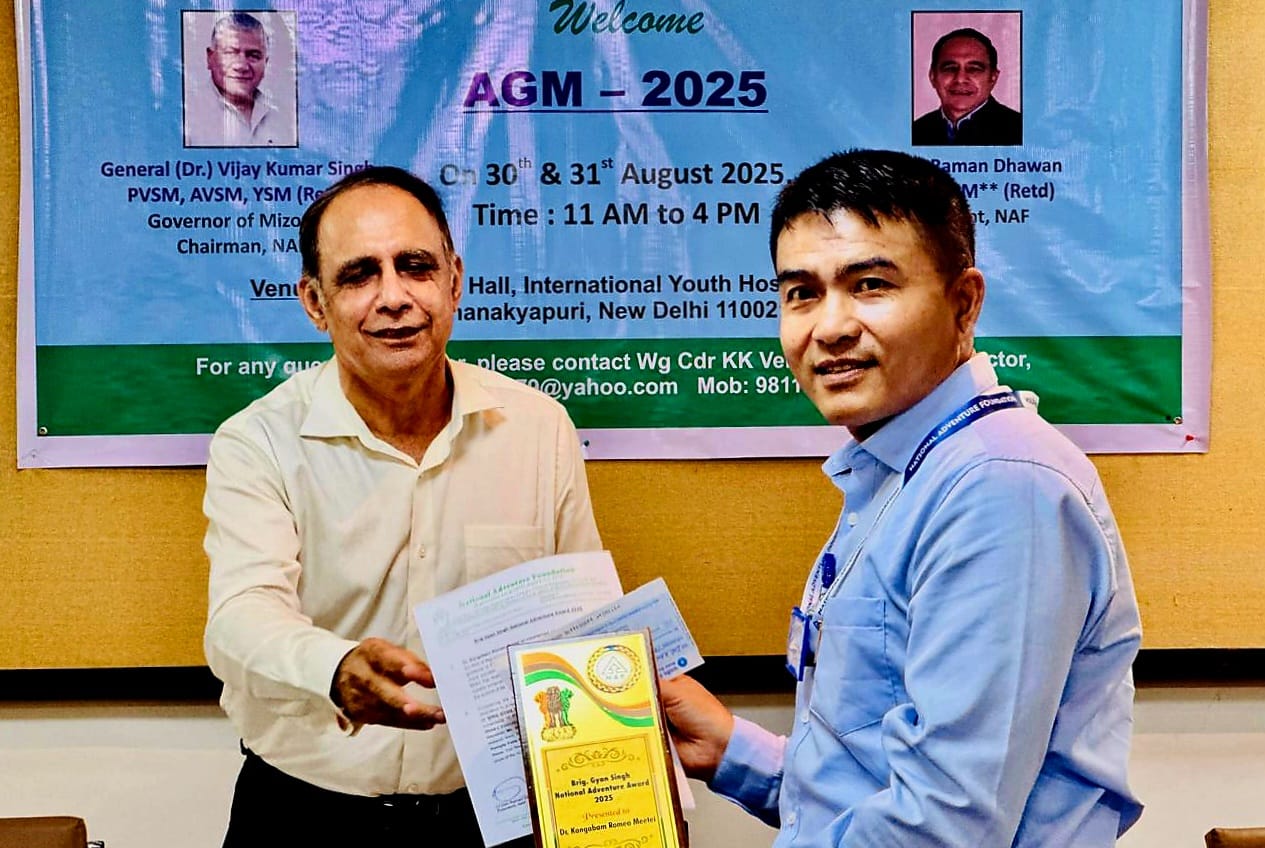 Imphal:  Dr. Kangabam Romeo Meetei, Director of the Manipur Chapter of the National Adventure Foundation (NAF), has been honored with the prestigious Brigadier Gyan Singh National Adventure Award 2025 in New Delhi. The award ceremony took place at YMCA New Delhi, with Lieutenant General Raman Dhawan, AVSM, VSM, ADC, President of NAF, presenting the honor.