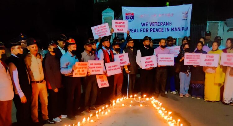 Imphal: The Armed Forces Ex-Servicemen Association of Manipur (AFESAM) and their families held a candlelight appeal for peace in Manipur in front of Kangla Gate, Imphal. Inclement weather and heavy downpour did not deter the spirit of the veterans and their families.